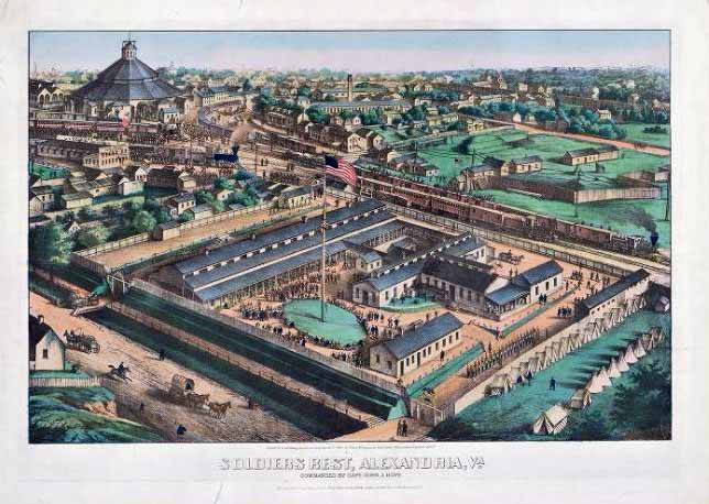 Soldier’s Rest, Alexandria, Virginia. U.S. Military RR Roundhouse upper left; Union Barracks in foreground
