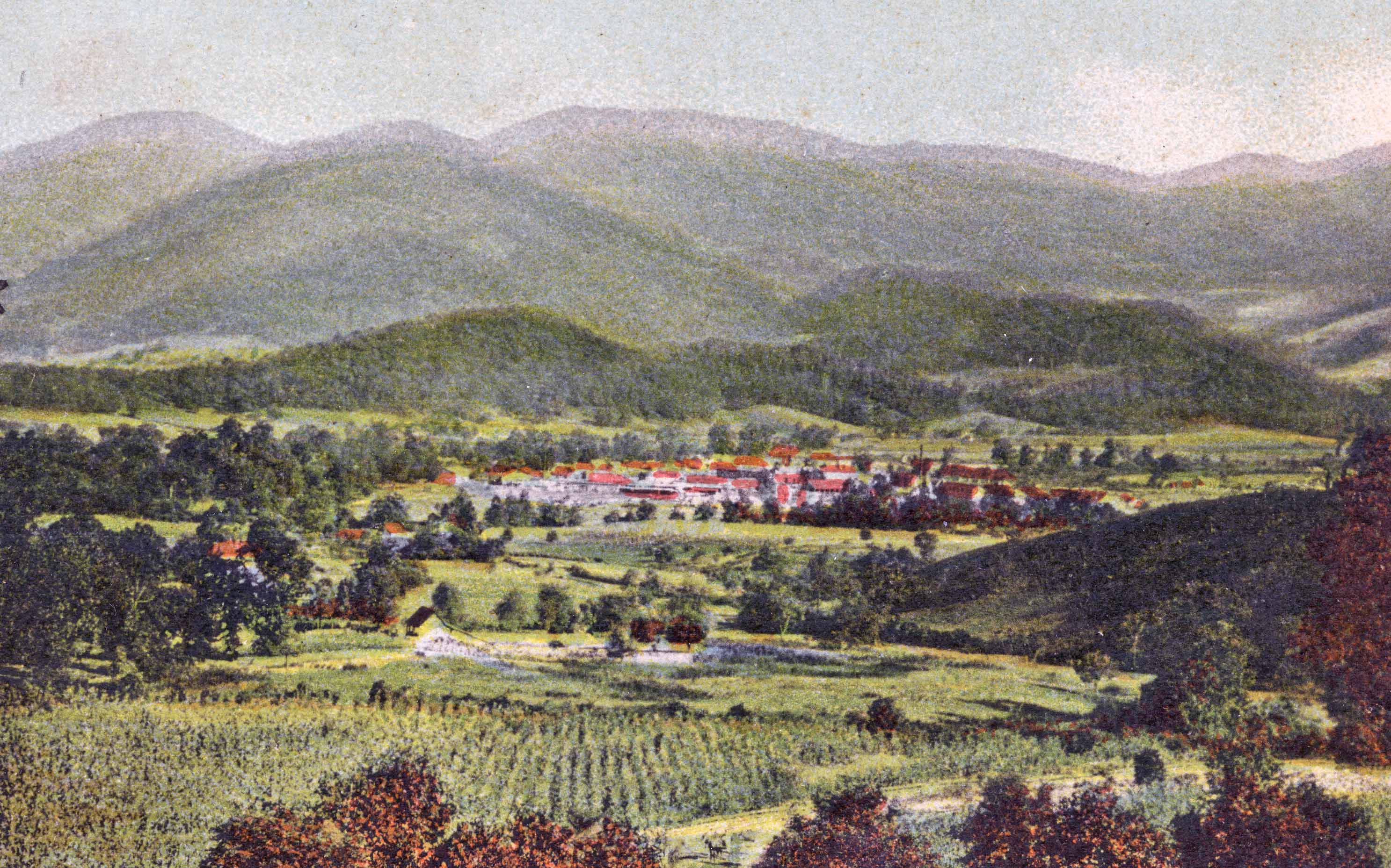 Waynesville, N.C., Lick Stone Range, Hazelwood from Junaluska Drive (postcard ca. 1900)