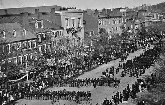 Procession for Abraham Lincoln on Pennsylvania Ave. from the White House to the U.S. Capital on April 19, 1865–his body lay in state there before traveling by train to Springfield, Ill. for burial