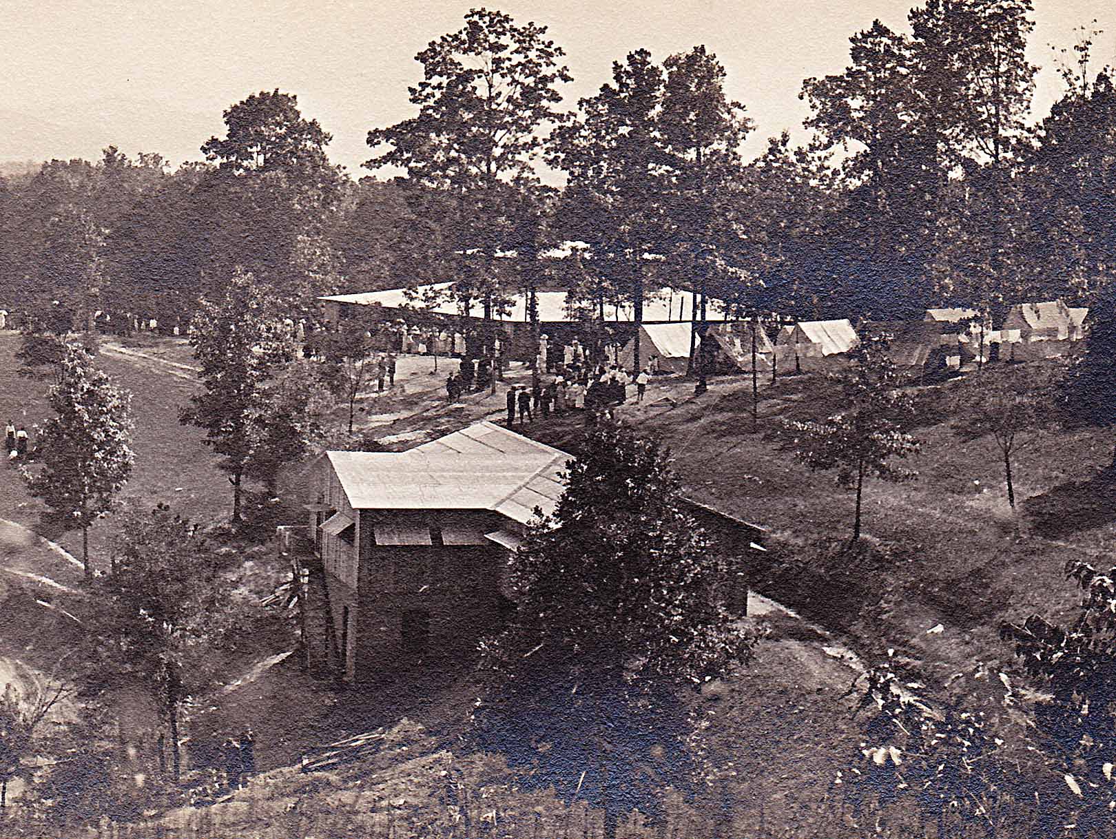 The Eliada Orphanage Camp Grove. The Faithful file into the Original Tabernacle. (photo ca. 1918)