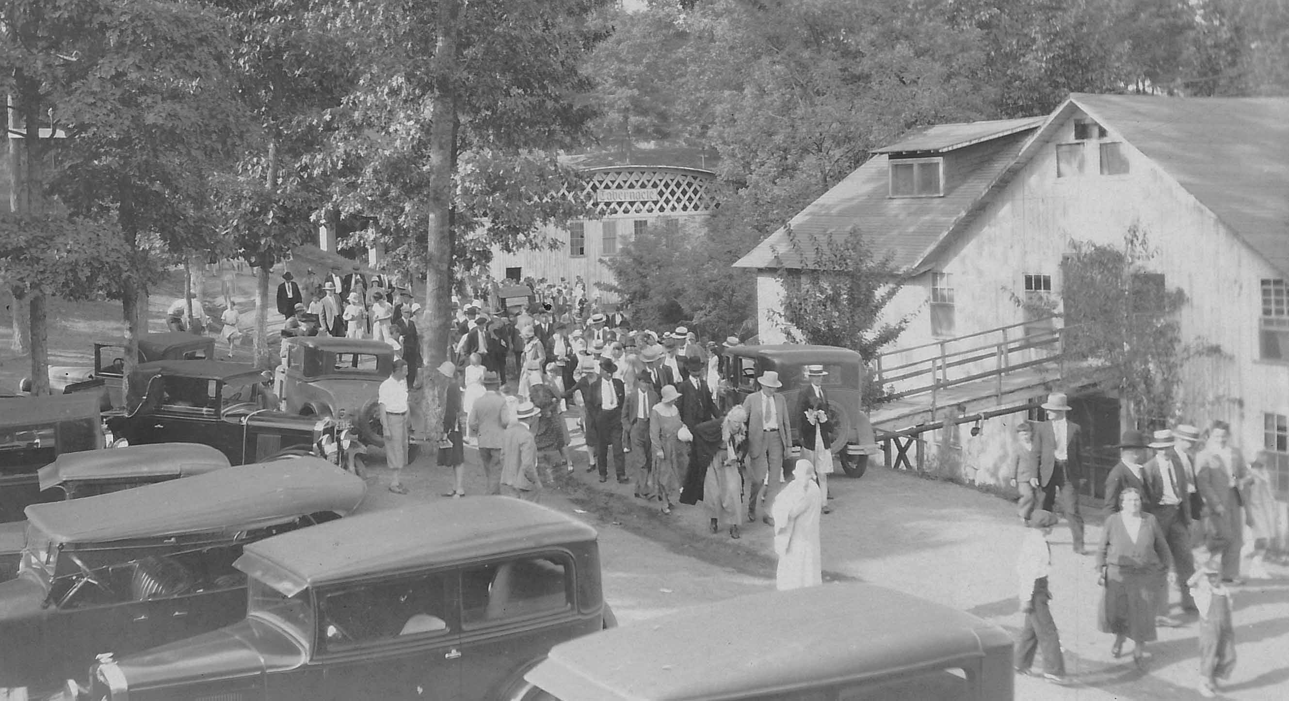Leaving the new Tabernacle. The dining hall (right) has been enlarged. (Photo ca. 1921)