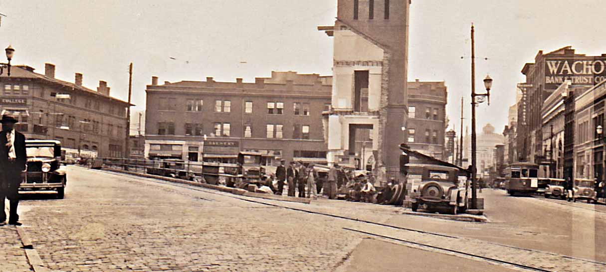 “The last of the old post office, Asheville, N.C. Spring 1932” The trolley is heading up Patton Avenue towards Vance Monument and City Hall. The College Street curve is on the left.