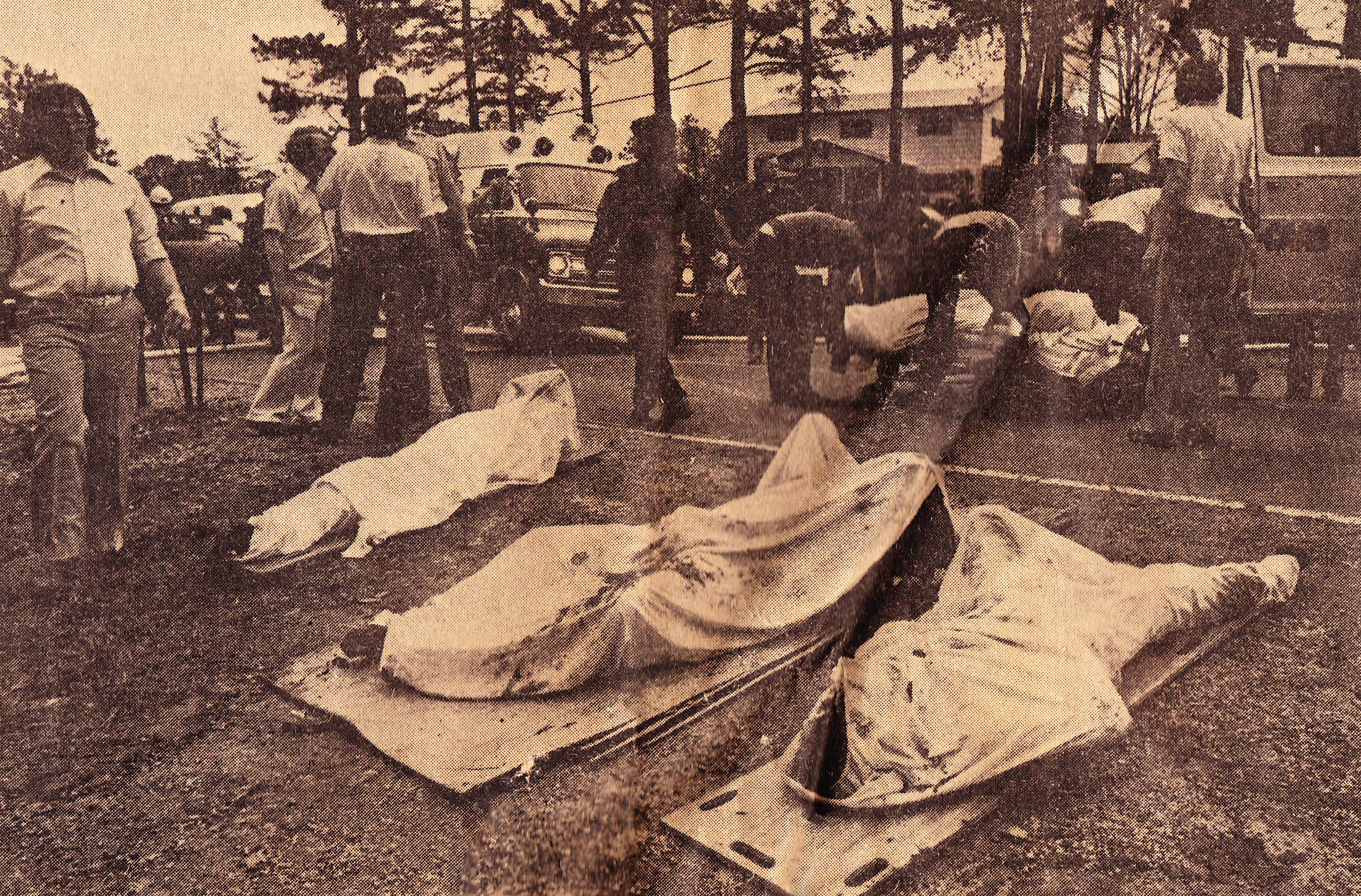 Covered bodies of the victims about to be taken to the temporary morgue in Dallas, GA