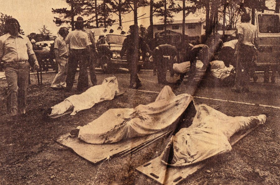 Bodies of the crash victims lined up in front of John Clayton’s house on April 4, 1977