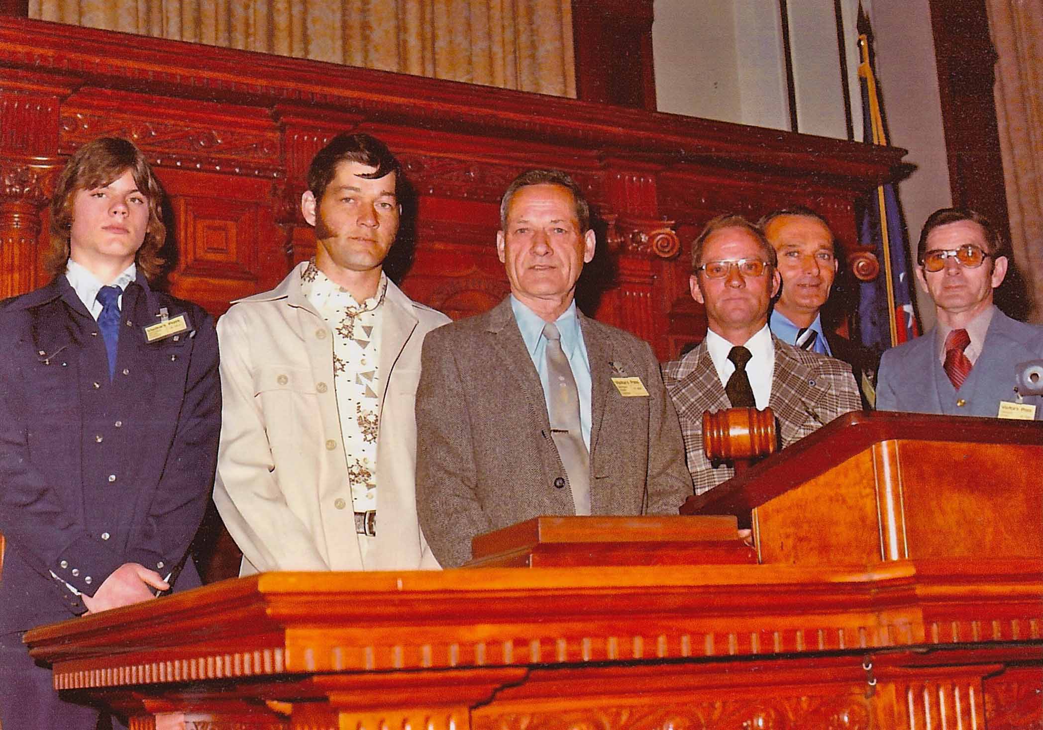 New Hope VFD members being honored by Governor Busbee. (L-R) Ricky Clayton, Richard Perry, Jr., B.P. Holbrook, Johnny Clayton, Johnny Wigley, and Doyle Camp