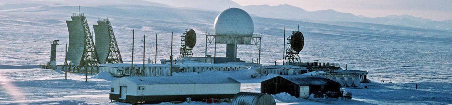 An aerial view of the radar station, one of 30 stations under U.S. Air Force control on the Distant Early Warning (DEW) Line which runs approximately 3,600 miles, from Alaska, across Northern Canada to Greenland.