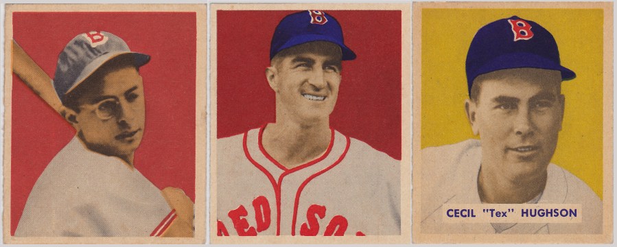 (l-R) Dom Dimagggio 1949 Bowman #64; Johnn Pesky 1949 Bowman #86; Cecil “Tex” Hughson, Bowman 1949 #240