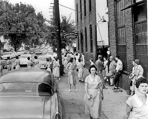 Standard Knitting Mills in Knoxville, TN at the 3:30 pm shift change in 1960. (Photo from the Knoxville News Sentinel)